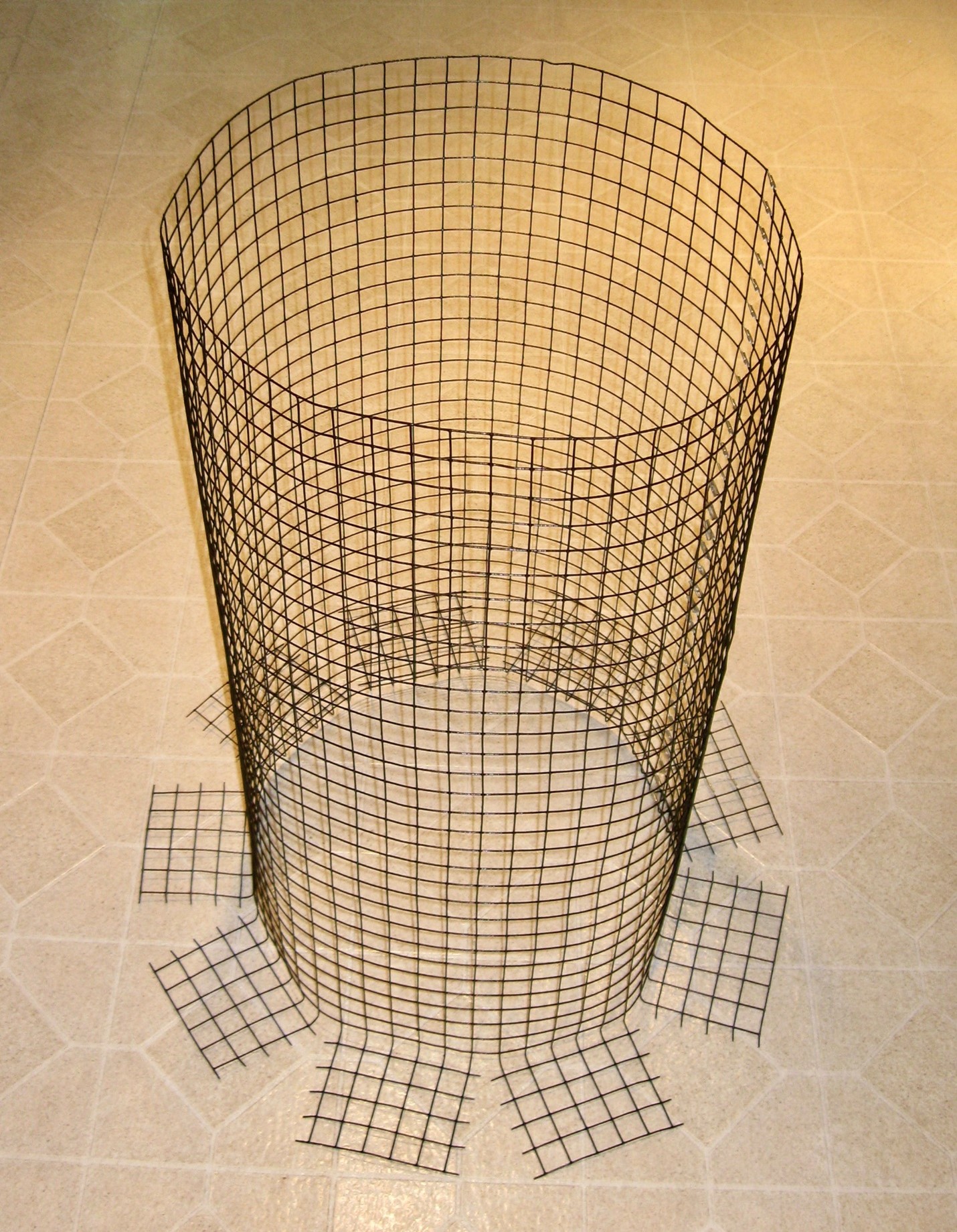 At one end of the cylinder I’d made, I snipped five wires at intervals of 6 inches, to make 6-inch square tabs that I bent outward by 90 degrees. The following photo shows the result. On the right side of this cylinder you can see the seam where I joined the cut ends of the wire-grid together